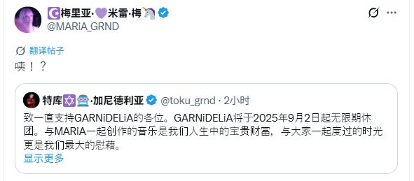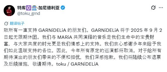 日本音乐组合GARNiDELiA于今日发文表示,将于今日(9月2日)起进入无限期活动休止状态。原定于年内举行的所有巡演场次将全数取消。更有意思的是,作为组合主唱的美依礼芽甚至都不知道组合解散了。